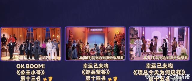 就这样,本赛段结束后,积分倒数第一的“幸运已来吻”喜团不幸团灭。的确,今年 张弛 和 蒋龙 作为团长,除了 《伯牙绝弦》 之外,没有给观众留下更深印象的作品。 特别是在这个赛段,这个喜团辛苦创排的 《虾兵蟹将》 和 《项总今天为何这样》 分别是倒数第二和第一的作品,更是没有在正片里播出。所以没有看到蒋龙饰演蟹将的造型,也基本上没有看到过郭甲醛的表演,这些都需要到共享版里去观看。