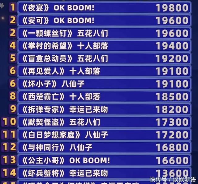 本来老将 闫佩伦 上场,是值得期待的,但是这个演唱效果,还是有些刻意和拉垮,没有闫佩伦往年角色出彩。最终18500的总成绩,已经算是对得起这个作品了,和同组四士同堂带来的古装作品还是有些差距的。 02OKBOOM!带来反差感低分作品 而说到古装作品,第五期那个压轴的《夜宴》就是一个很高的成绩。由此,观众其实对OKBOOM!喜团就有了更多期待。但是这次的作品反差比较大,分数出来后,也不意外,这样的闹剧作品也只能得到观众的16000票。